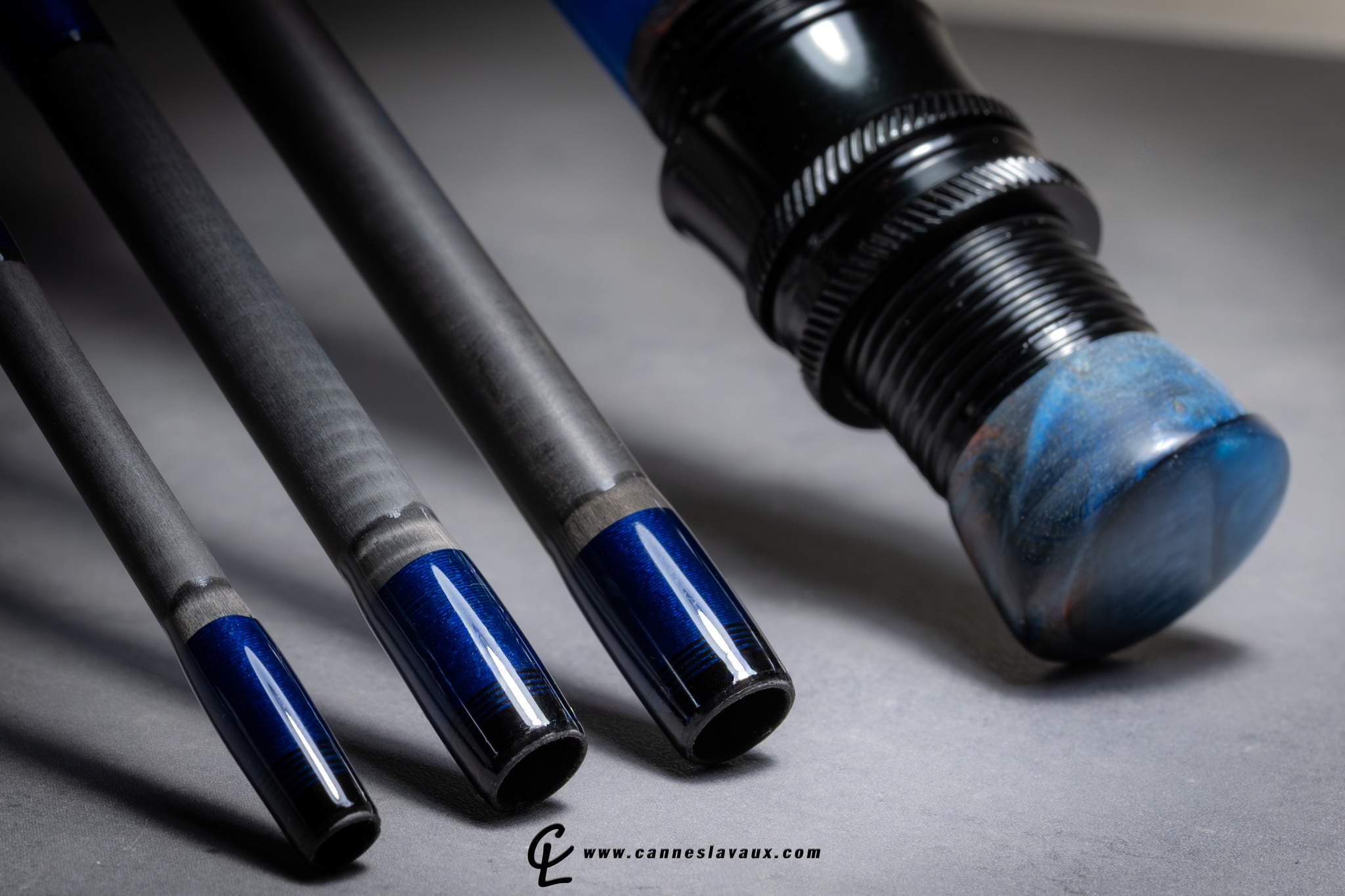 - Ligatures bleue pour les anneaux et dégradé noir et bleu pour les emmanchements et zone d’inscriptions
